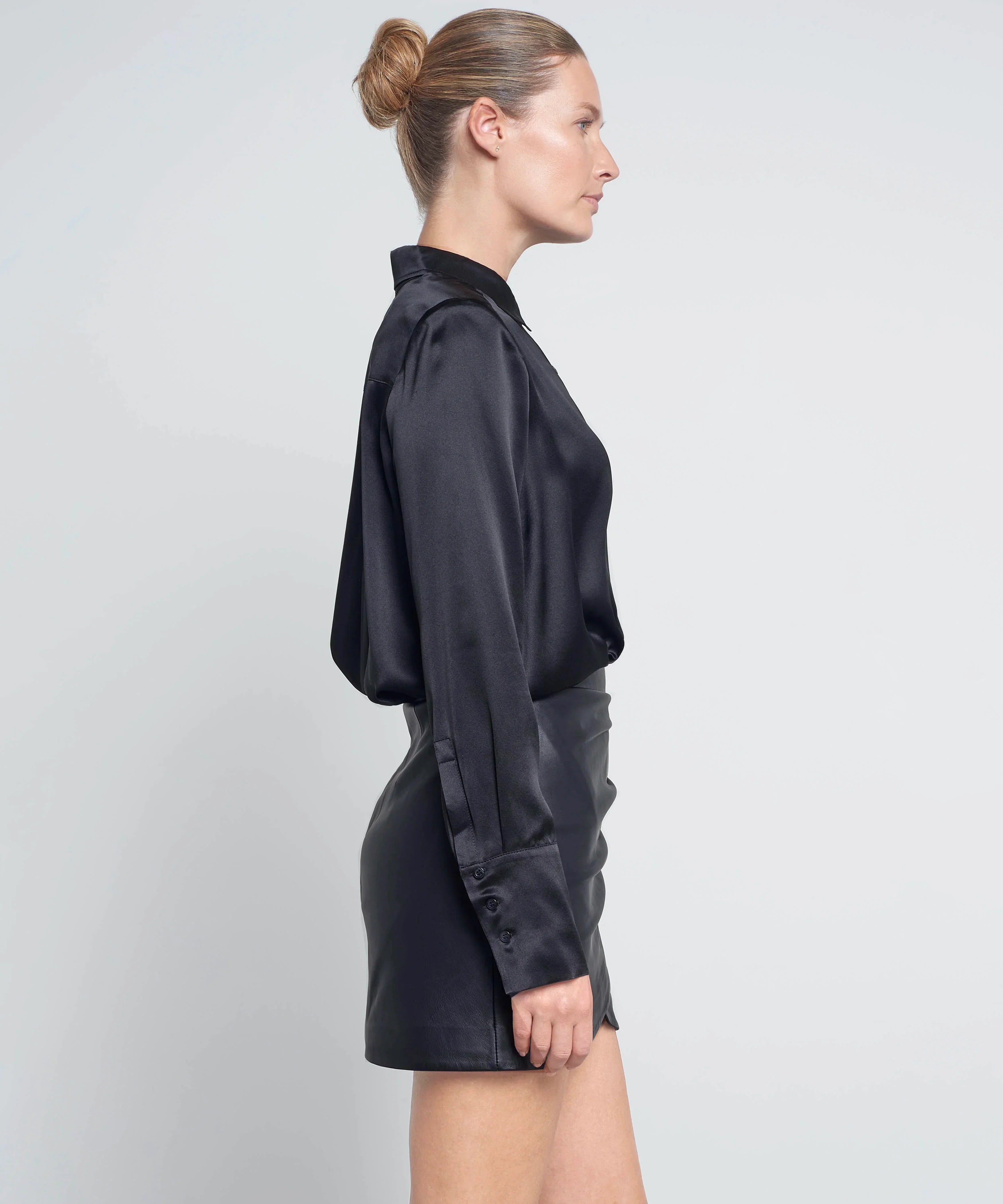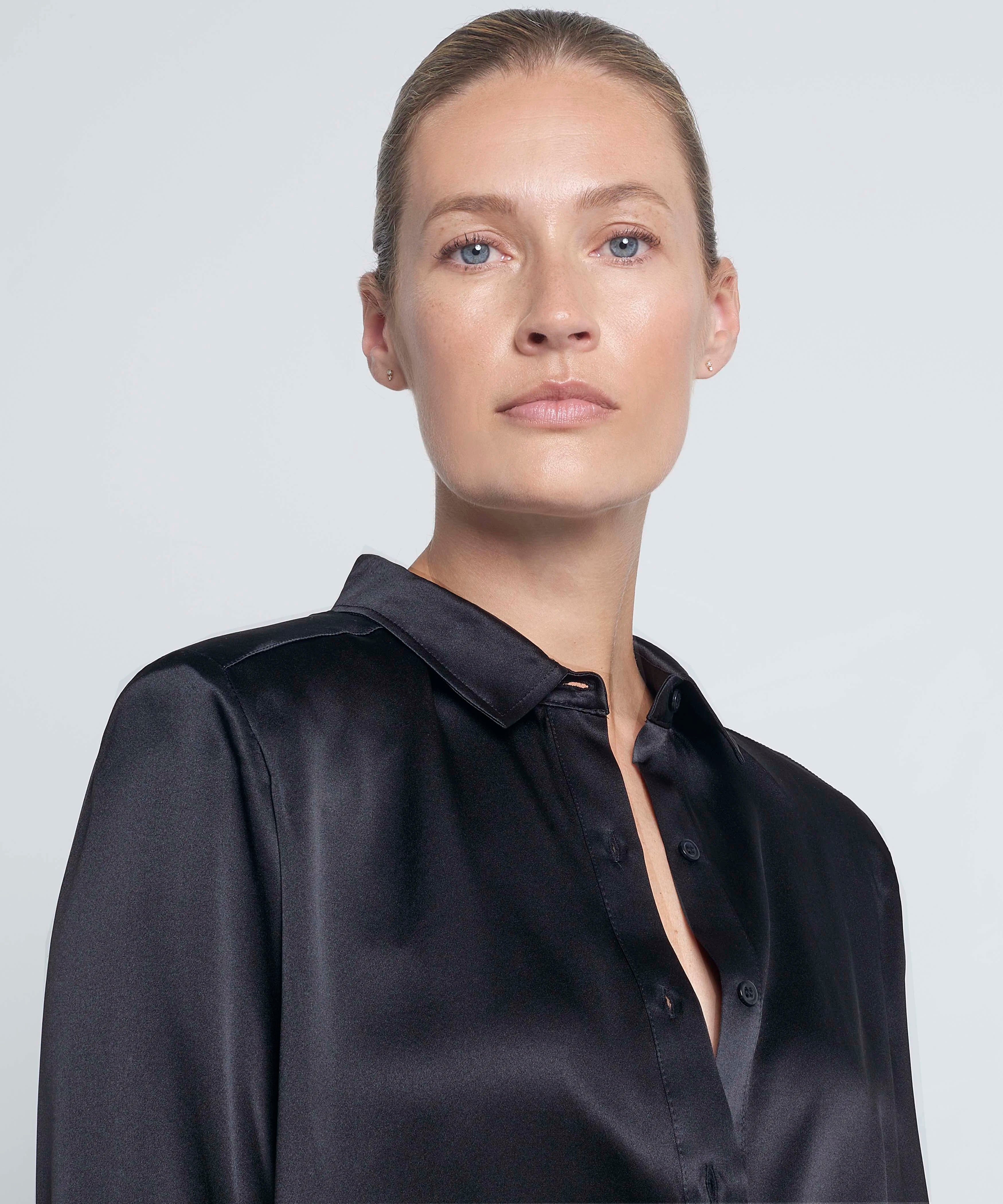 Made with 100% luxury silk, this garment is a key wardrobe investment. The shirt is slightly oversized with quality shoulder pads which creates a boxier silhouette. The minimal pleat back and staggered hem creates structured and elegance. The design features a fully back buttoned front, with collar and double button deep cuffs which provides versatility in how the garment is worn. The premium fabric and finish create a lustre and sheen that is divine to handle and wear. The piece is finished with NOVO's signature logo embroidered on the left arm cuff.