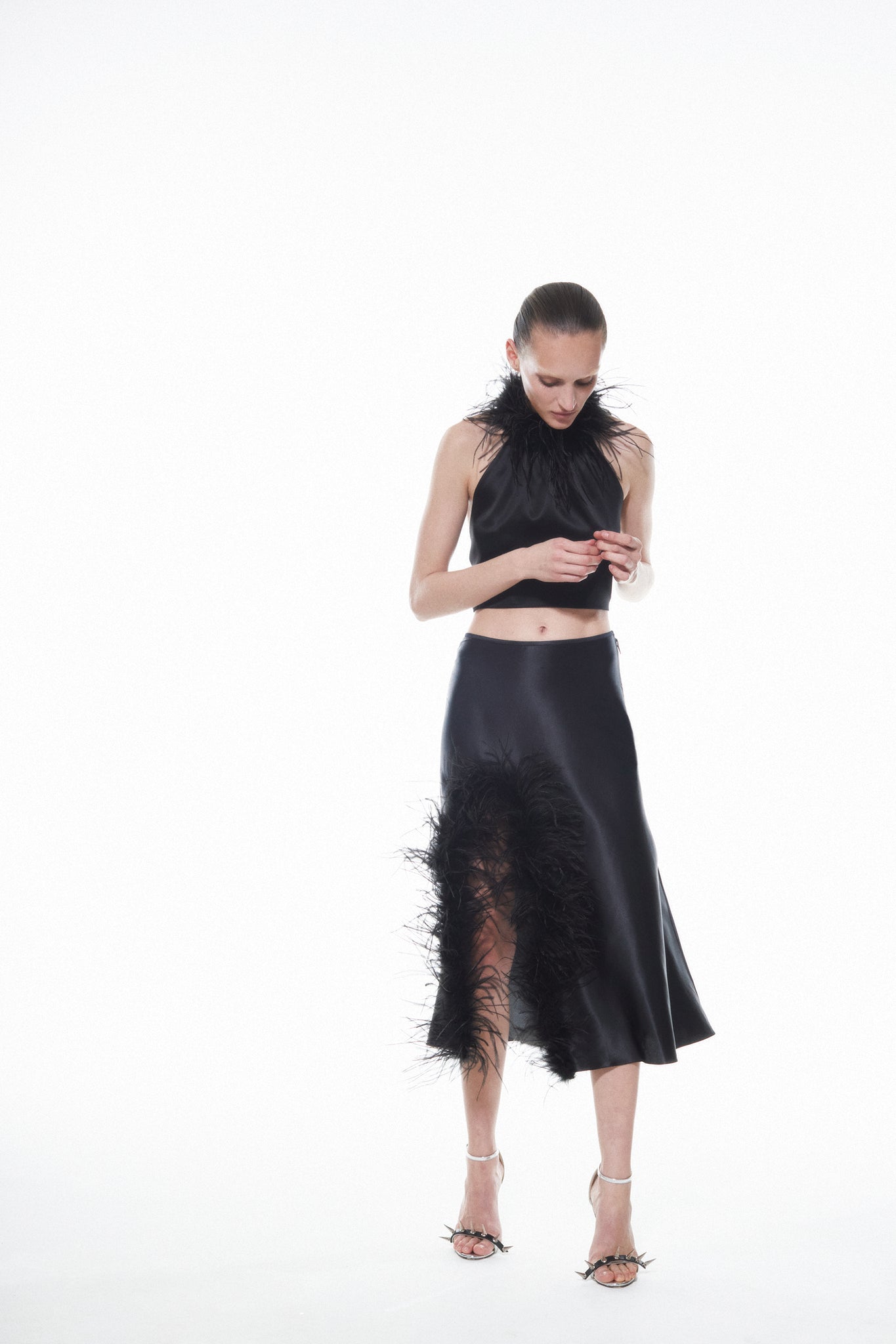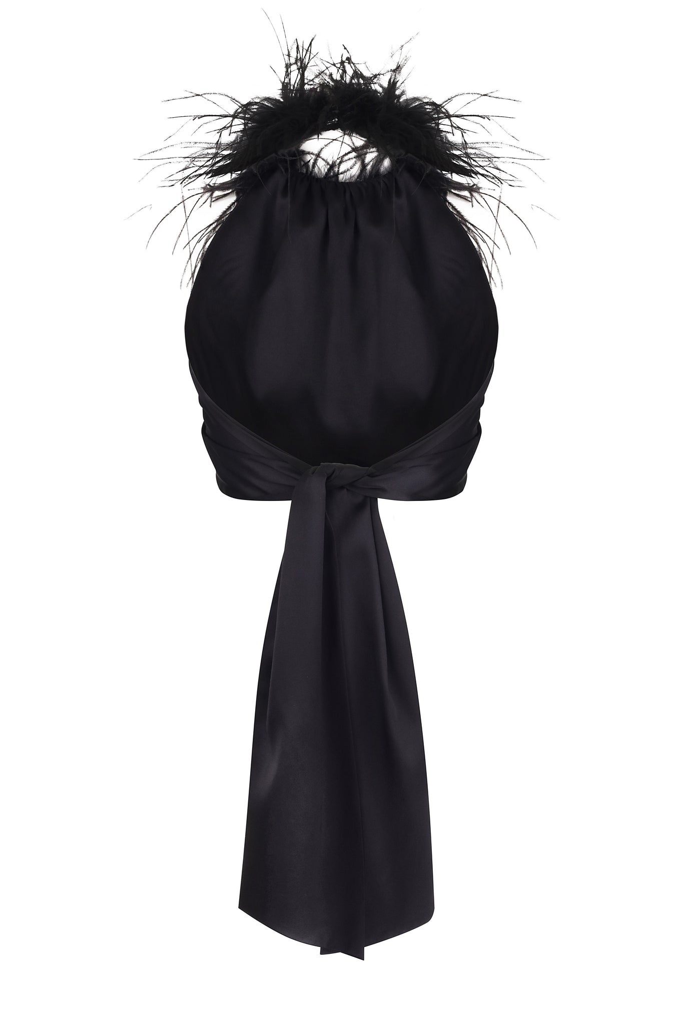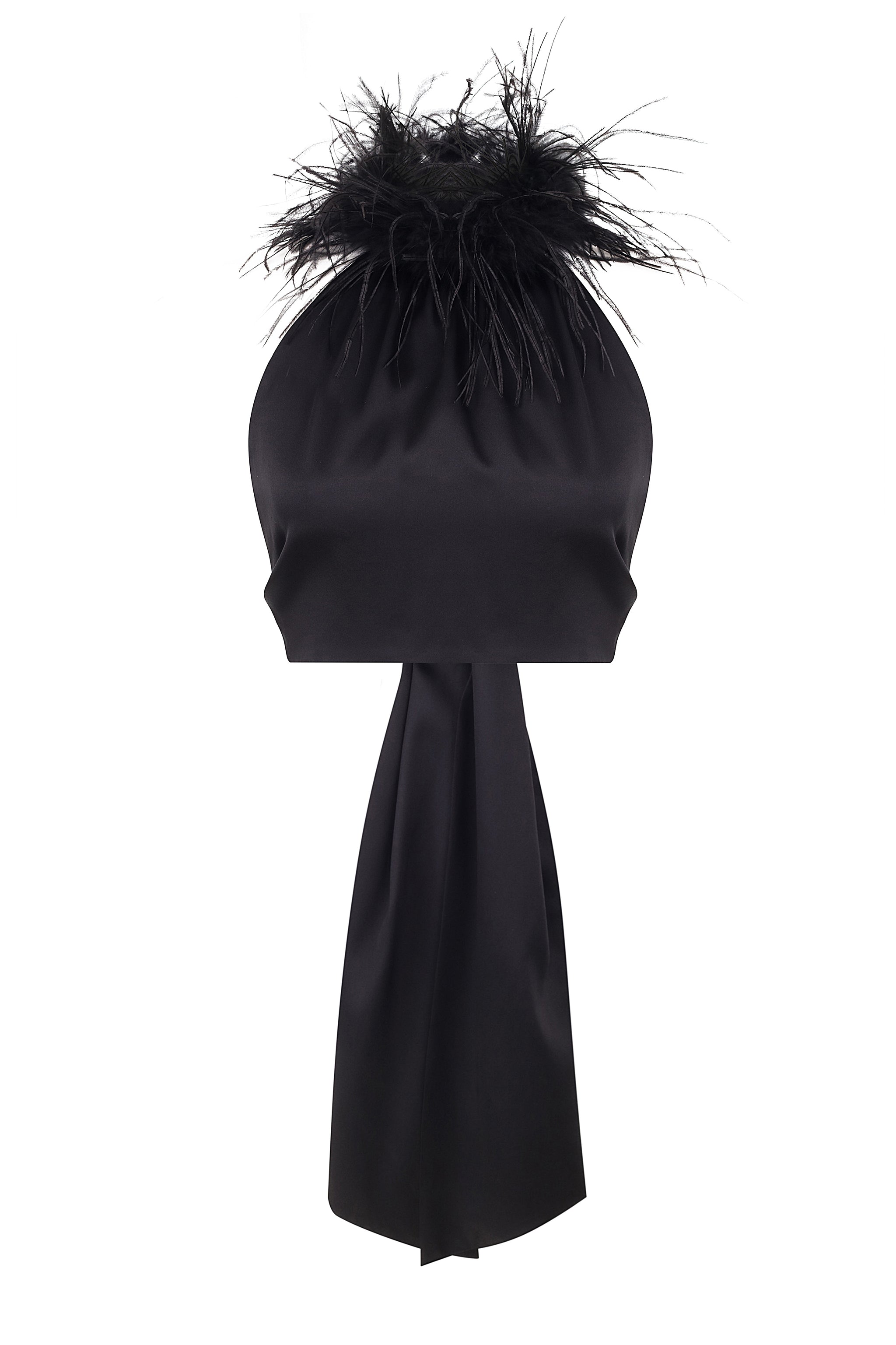 Kaia top has a halterneck silhouette with an alluring open back. It is crafted from natural Italian silk with wide ties at the back and a collar accented with ostrich feathers.